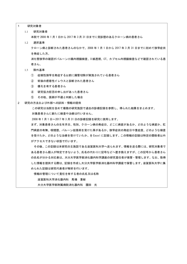 本研究は2008年1月1日から2017年3月31日までに大分大学医学部附属病院消化器内科において受診歴のある「クローン病」患者さんを対象とします。その中でも2008年以降に症候性狭窄(イレウス・腸閉塞症状)が明らかとなったクローン病症例全例を抽出して検討を行います。症候性狭窄に対する治療状況の診療情報を振り返って確認する事によって、データ集積を行います。具体的には治療薬の使用状況や経過中に施行した内視鏡所見や内視鏡的バルーン拡張術の施行状況について調査します。集積されたデータをもとに症候性狭窄に対する薬物療法や内視鏡的バルーン拡張術が腸管切除に与える影響について過去の診療記録をさかのぼって検討し、解析を行います。一施設では限られた症例数となるため、本研究の代表施設である滋賀医科大学医学部が、本院を含め全国より参加施設を募り研究を遂行します。本研究により症候性狭窄を来したクローン病患者の予後予測が可能となり、適切な治療選択が可能になることが期待されます。